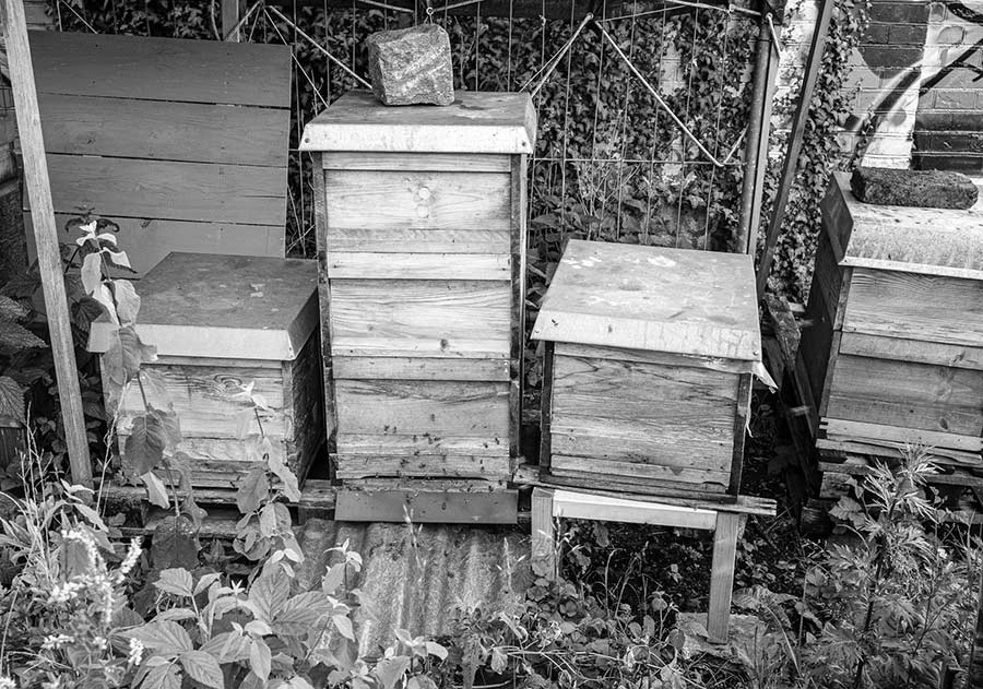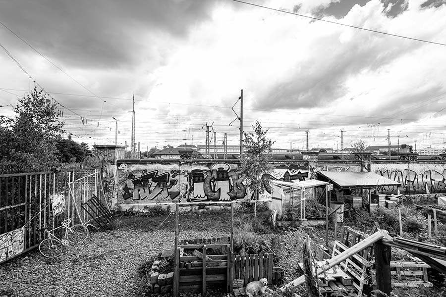 Wir überqueren das ruhende Schlachtfeld. An dessen entlegenen Rand schmiegt sich an die Mauer, die das Gelände von den dahinterliegenden Bahngleisen trennt, ein winziger geheimer Paradiesgarten. Geheim natürlich nur, wenn man ihn noch nicht kennt. Welche Entzückung an diesem unseligen Ort! Die wahren Geheimnisse, selbst nachdem sie gelüftet, erklärt, analysiert und fotografiert sind, bleiben rätselhaft. Die heilige Johanna der Schlachthöfe ist zu den Pflanzen zurückgekehrt. Sie kämpft nicht für billiges Fleisch, sie pflanzt Salat, Zucchini, Kohlrabi und Karotten. Sie bewässert das dem Schlachthofbeton abgerungene Stück Erde. Drei Jahre lang musste sie warten, bis ein Beet im Garten frei wurde. Ein Kollektiv engagierter Nachbar*innen hat den Platz geschaffen. In den Hochbeeten aus Transportpaletten wächst, rankt und blüht es in schöner wildorgansierter Vielfalt und Einzigartigkeit. Bienen summen um einen Bienenstock herum, gelbe Ringelblumen strahlen der Sonne entgegen, dann und wann rattert hinter der Mauer ein Zug vorbei.