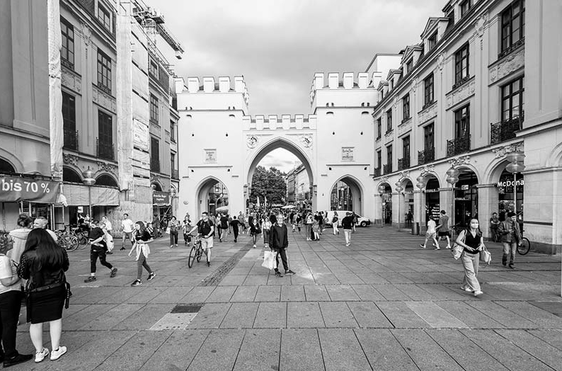 Die Redensart, dass es irgendwo zugehe wie am Stachus, ist den deutschen Wirtschaftswunderjahren der Nachkriegszeit geschuldet, als sich der Stachus zu einem der verkehrsreichsten Plätze Europas entwickelte. Erst nachdem im Vorfeld der Olympischen Spiele die Straße vom Marienplatz zum Karlstor in eine Fußgängerzone umgewandelt worden war und das Stachus Untergeschoss, vier Stockwerke Verkehrsfläche unter der Erde, als zukunftsweisendes Einkaufszentrum entstand, wurde es oberirdisch etwas ruhiger. Aber nicht sehr. Der Autoverkehr fließt noch immer vierspurig, Trambahnen biegen zum Hauptbahnhof ab, Fußgängerpulks und Radfahrende queren den Ampelübergang beim Justizgebäude. Will man von der einen Seite der Fahrbahn auf die andere gelangen, benötigt man zwei Grünphasen. Die Sommerferien haben Tourist*innen und Einheimische in die Innenstadt gespült, in der Fußgängerzone herrscht wieder Geschäftigkeit. Nur ein kleines, an den Handgelenken der Einkaufenden baumelndes, in diesen Tagen unverzichtbares Accessoire zeigt an, dass auch wir, wie der Platz, an dem wir uns befinden, ein doppeltes Gesicht tragen. Wir sind Gefährdete und Gefährder zugleich. Jeder Einkaufsbummel ein Maskenball, ein doppeltes Spiel. „Wo geht es zum guten Leben?“ – „Ende des Anthropozäns? Immer geradeaus.“
